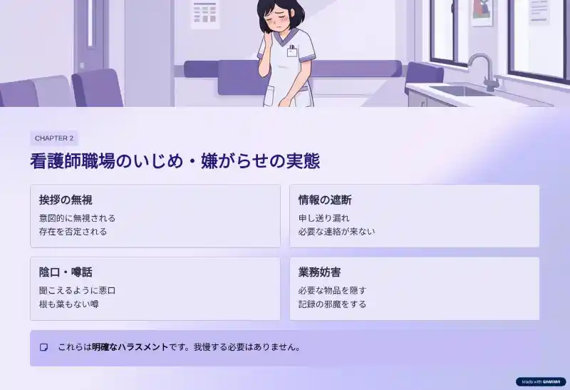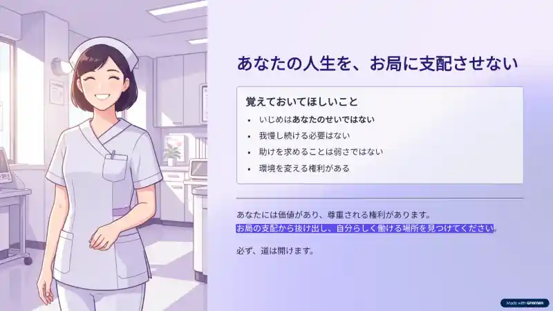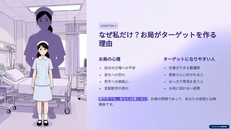 看護師の職場は閉鎖的になりやすく、一度ターゲットにされてしまうと、個人の努力で状況を覆すのは非常に困難です。