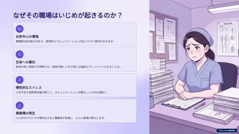 - 教育体制の不備: 指導方法がバラバラで、新人が放置され、攻撃の対象になりやすい。