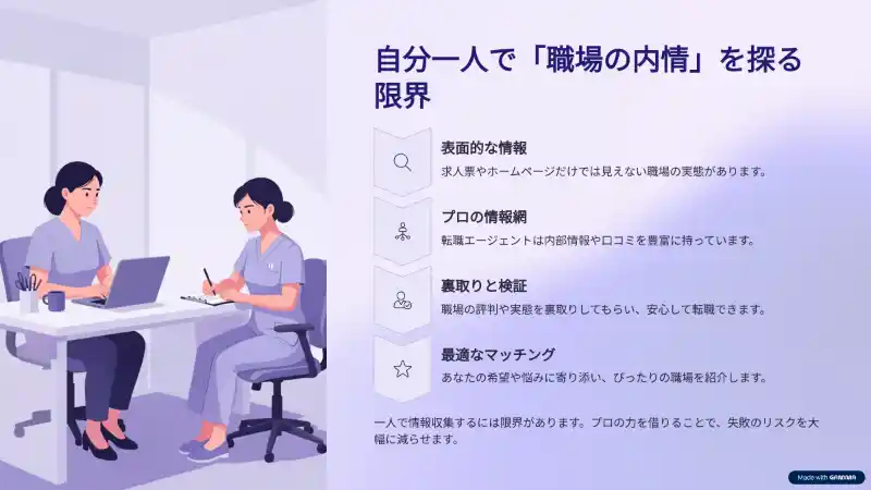 だからこそ、現場の離職理由や、実際の雰囲気を「裏取り」している転職エージェントを味方につけてください。